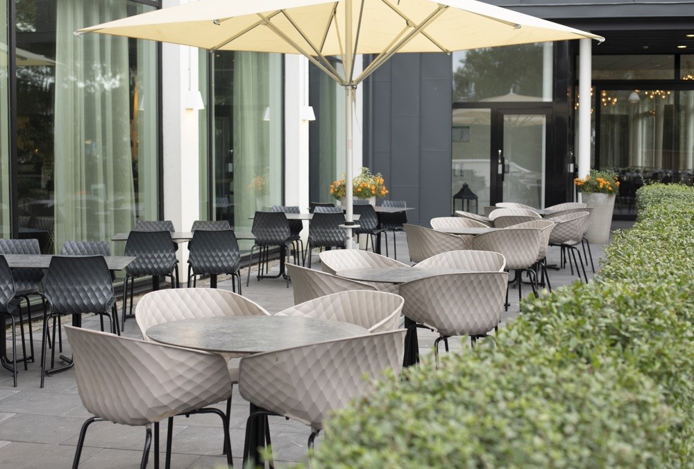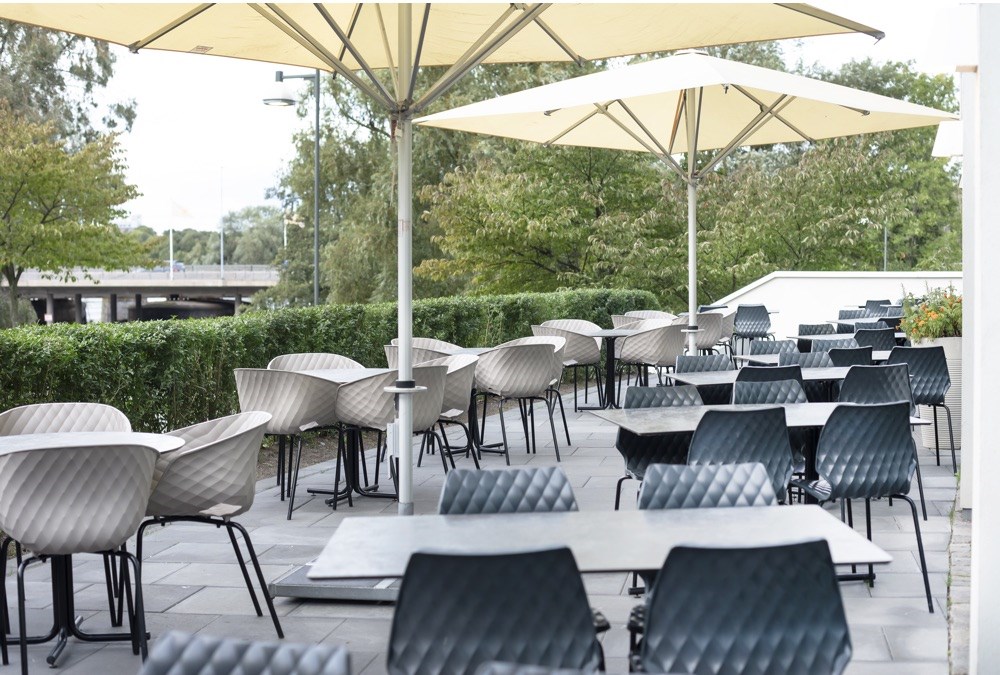 The Italian-made Uni 550 & Unika 594 chairs in the gorgeous Turtle Dove taupe and black bring stylish coolness to this outdoor restaurant space. Durability, function and interesting design are combined in these Uni series that are ideal for both indoors and outdoors use. Uni-Ka is a product which captivates with its rounded and welcoming shape; a go-anywhere chair, as the polypropylene seat color variations and the various choices of wood base make it ideal for all gatherings, and particularly suitable for restaurants and hospitality premises.